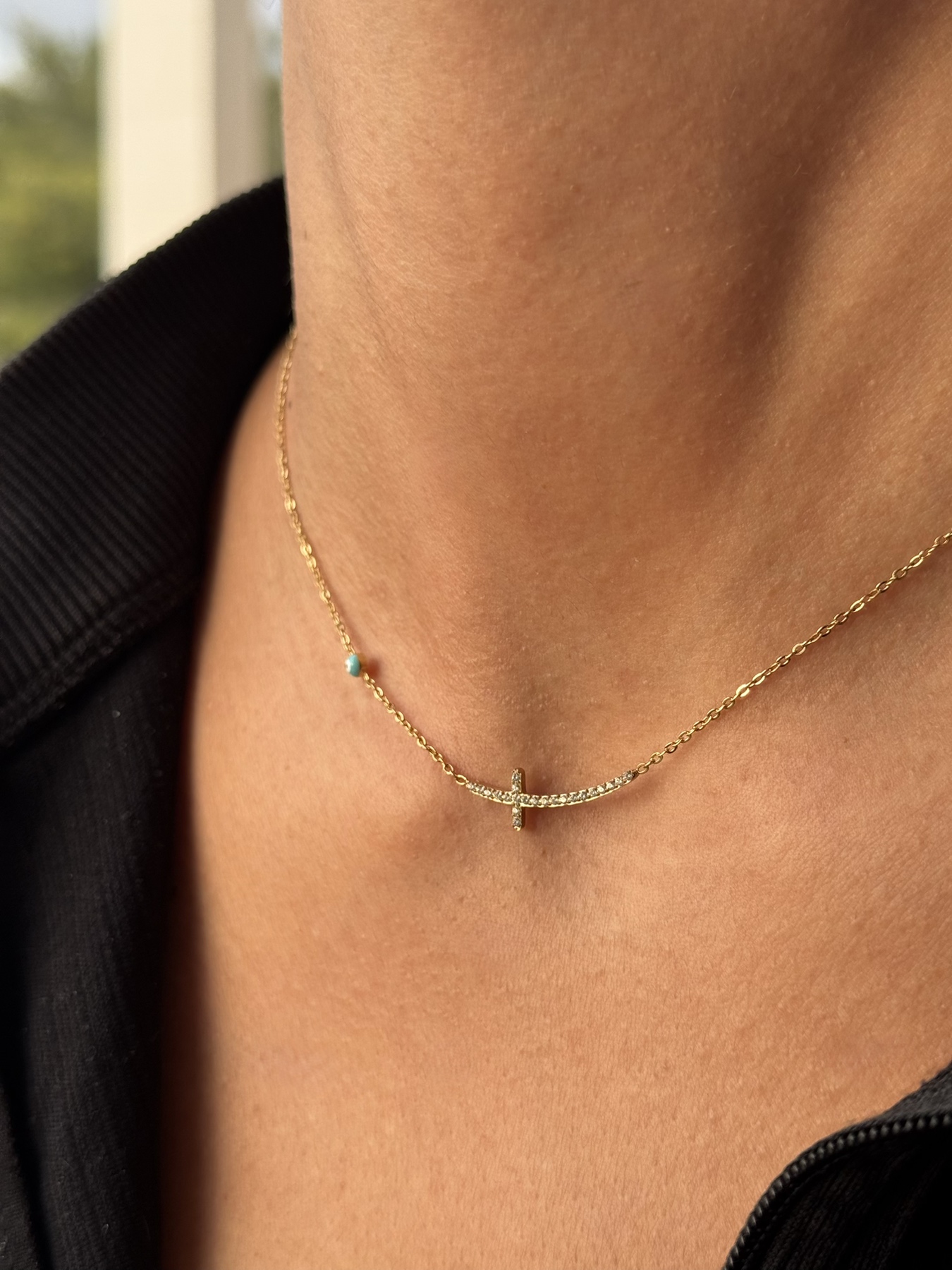 Λεπτό κολιέ με πλαϊνό, καμπυλωτό σταυρό διακοσμημένο με λαμπερά ζιρκόν και ένα μικρό τιρκουάζ “μάτι” στο πλάι για μια παιχνιδιάρικη πινελιά. Minimal και διακριτικό, ιδανικό για καθημερινό στιλ ή layering με άλλες αλυσίδες. Ελαφρύ, άνετο και απόλυτα θηλυκό, το κομμάτι που δεν βγάζεις από πάνω σου!