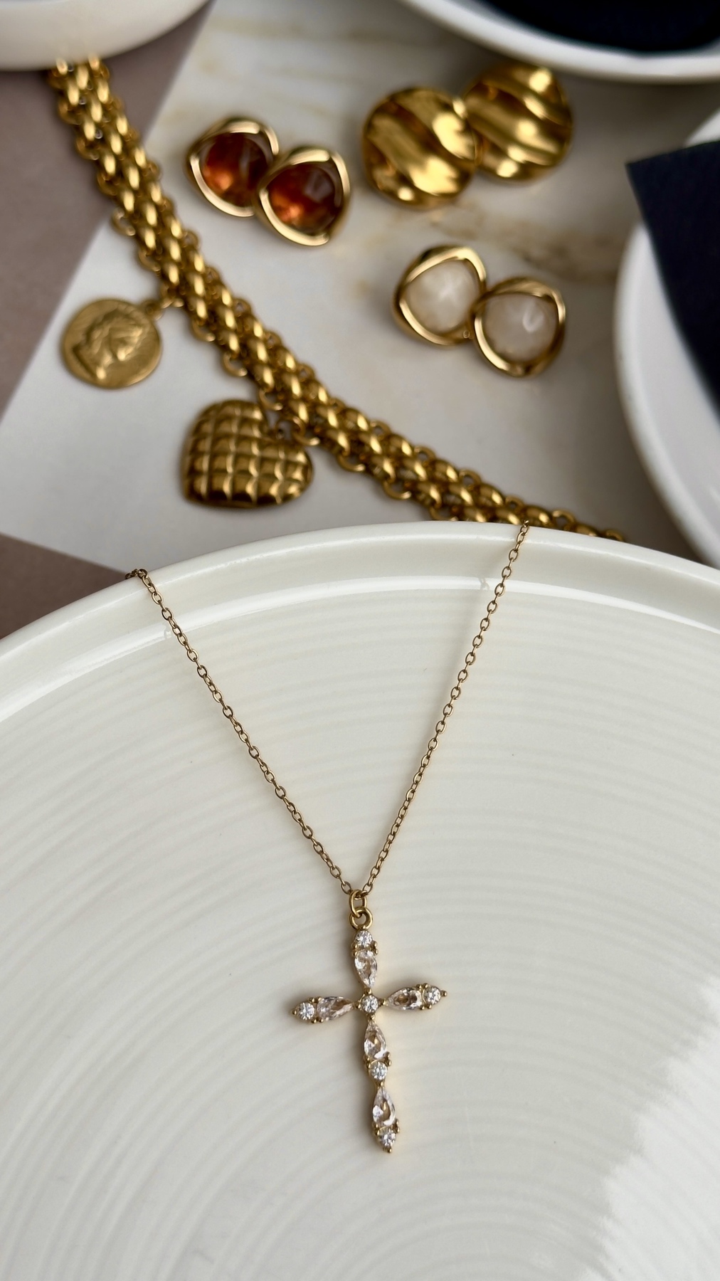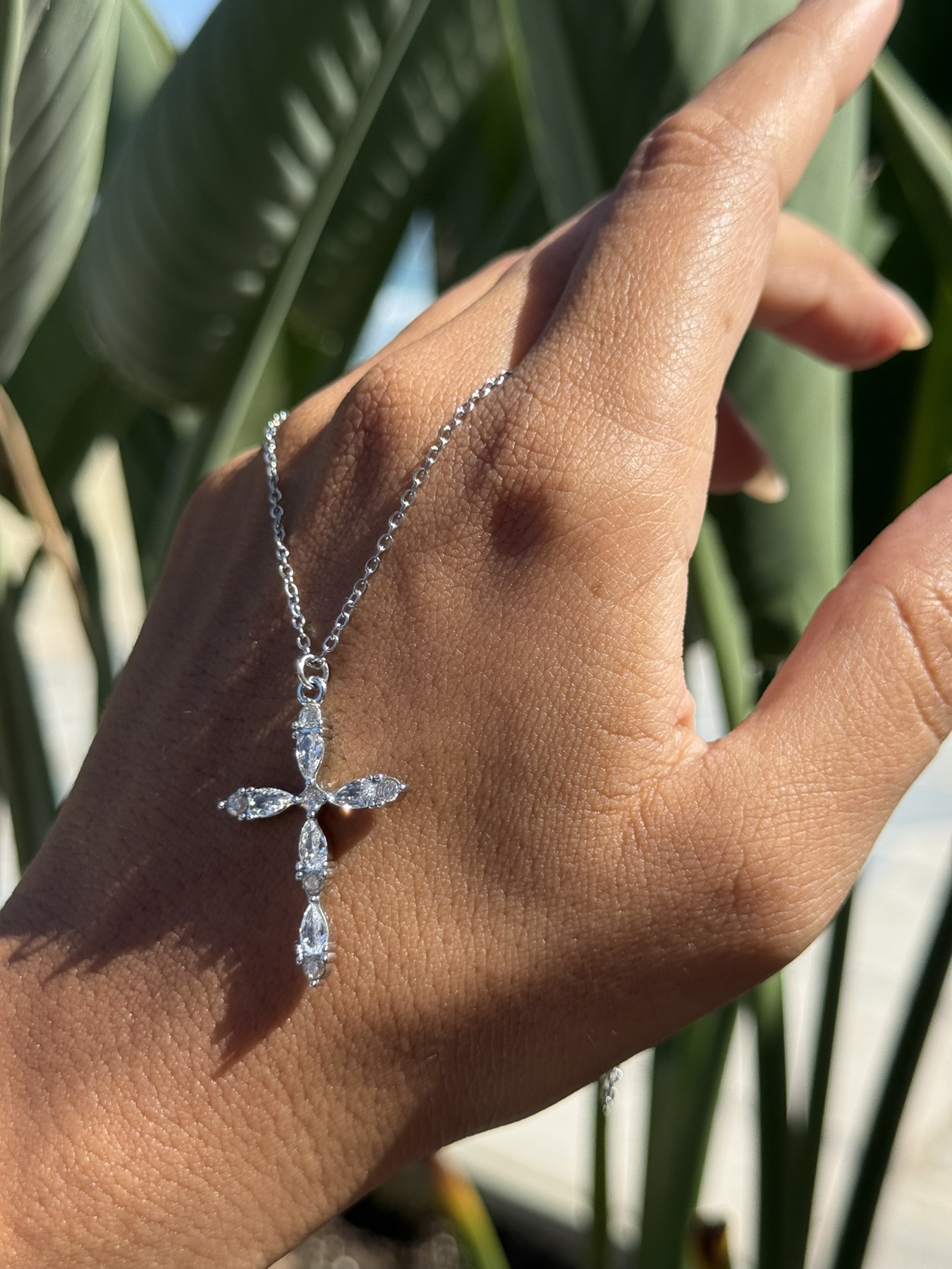 Λεπτεπίλεπτος σταυρός με πεταλοειδείς λευκές πέτρες που γυαλίζουν. Μοντέρνος, ταιριαστός με όλα σου τα outfits. Διαθέσιμος σε ασημί και χρυσή απόχρωση.