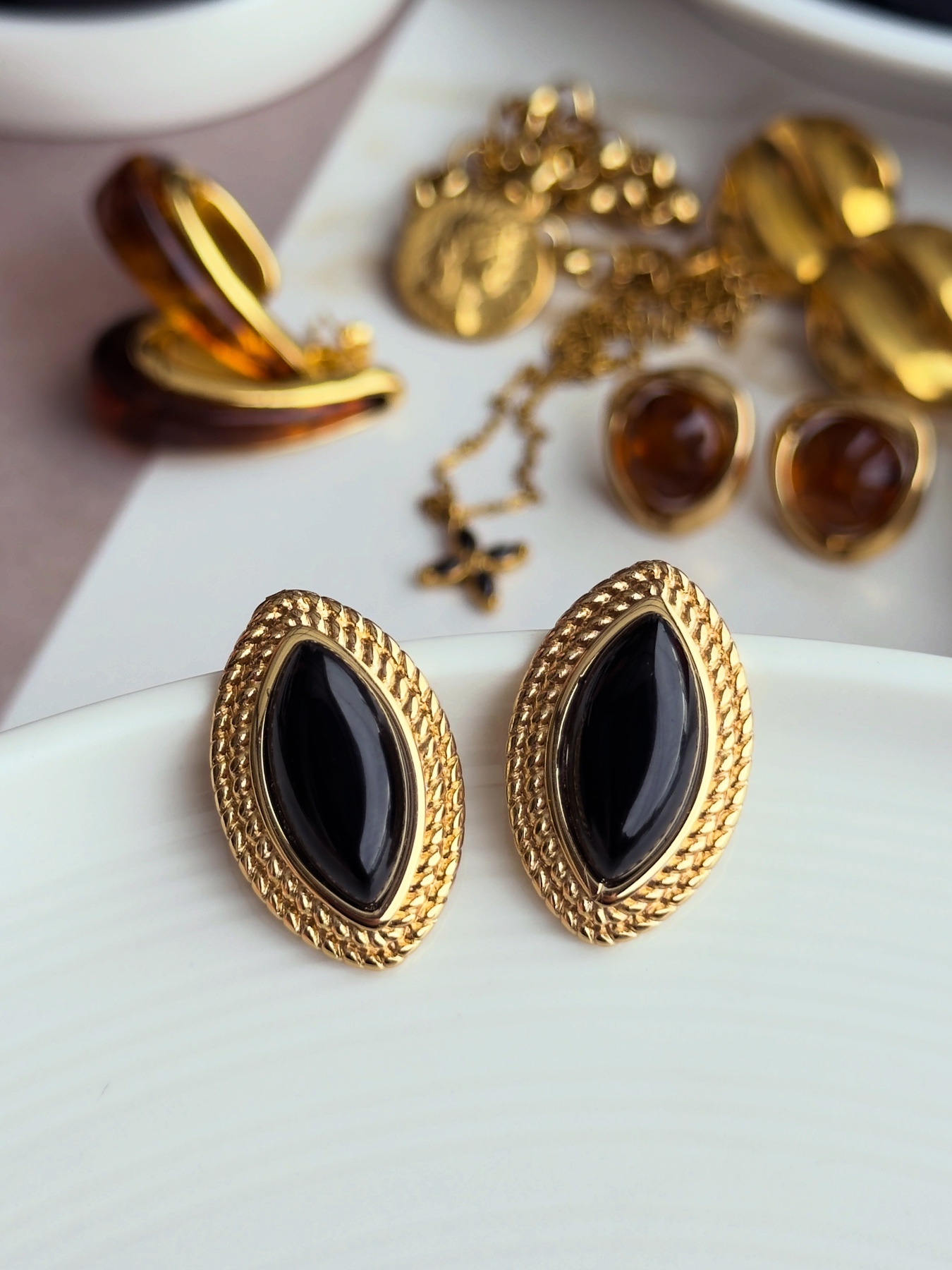 Statement σκουλαρίκια από ανοξείδωτο ατσάλι σε χρυσαφί, σαγρέ πλαίσιο με μαύρη πέτρα εμπνευσμένο από κλασικά, αρχοντικά κοσμήματα.