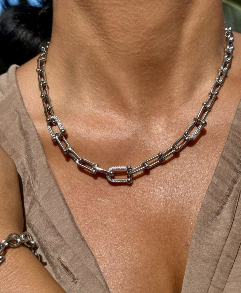 Βραχιόλι αλυσίδα σε χρυσή απόχρωση με ανάγλυφους, ορθογώνιους κρίκους και λαμπερές pavé λεπτομέρειες. Κεντρικό στοιχείο με T-bar που προσθέτει modern-luxe χαρακτήρα και σταθερό κράτημα. Ιδανικό μόνο του ή συνδυασμένο με το κολιέ της σειράς για day-to-night εμφανίσεις.