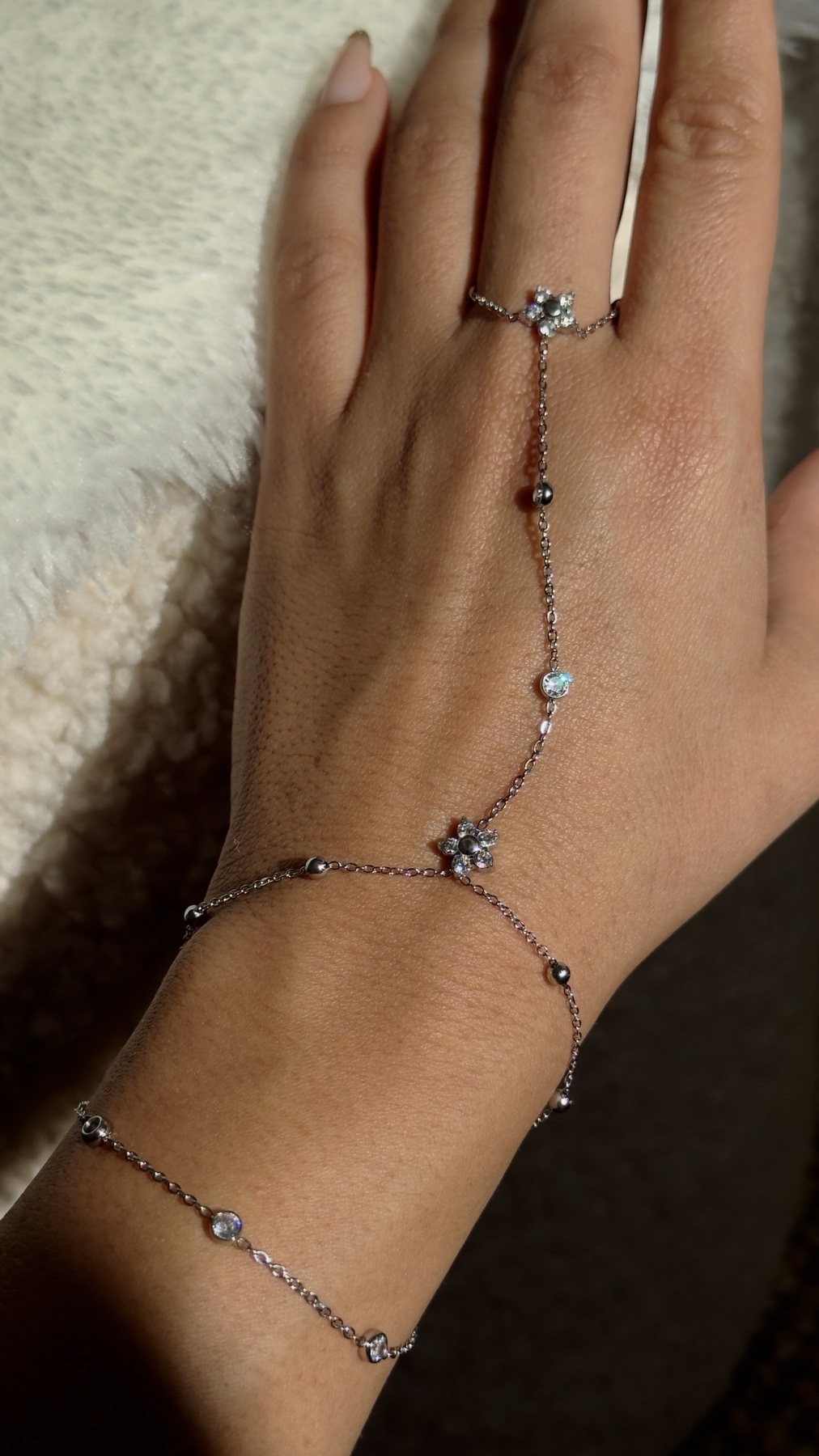 Το απόλυτο hand chain που ενώνει βραχιόλι και δαχτυλίδι με λεπτή αλυσίδα, λουλουδάκια και λαμπερά κρυσταλλάκια. Στον καρπό η αλυσίδα είναι διπλή, ενωμένη με ένα ενιαίο κούμπωμα. Δε θα θες να το βγάλεις!